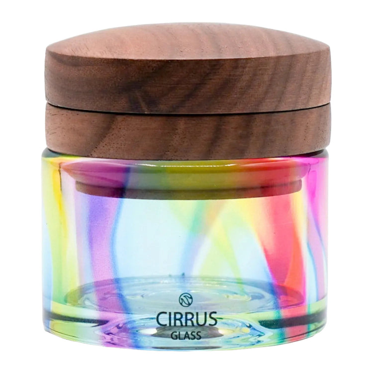 Cirrus Glass Grinder, thoughtfully engineered for the everyday smoker. Milled aluminum teeth, sculpted walnut core, and a borosilicate base in perfect harmony. The vibrant Rainbow finish adds artistic flair to this essential piece. Hand-crafted for the perfect grind.